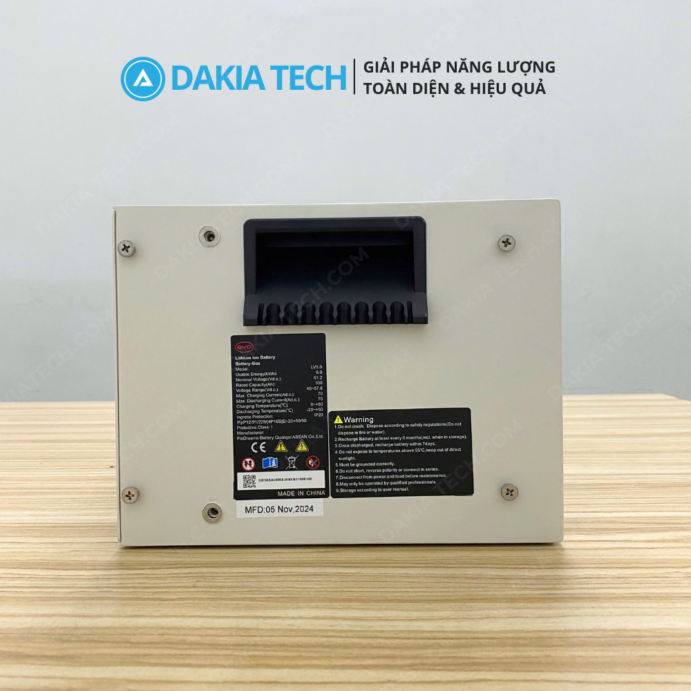 - Dung lượng hữu dụng: Đạt 5kWh cho mỗi mô-đun. Khác với nhiều dòng pin giá rẻ trên thị trường thường có độ xả sâu hạn chế, BYD cam kết hiệu suất sử dụng dung lượng thực tế cực cao.